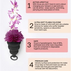 Il principale vantaggio e innovazione della Gcup è la struttura interna. All‘interno del contenitore è presente una valvola di ritegno che impedisce la fuoriuscita del liquido. La coppetta mestruale Gcup è a forma di campana, che ne facilita l‘utilizzo.