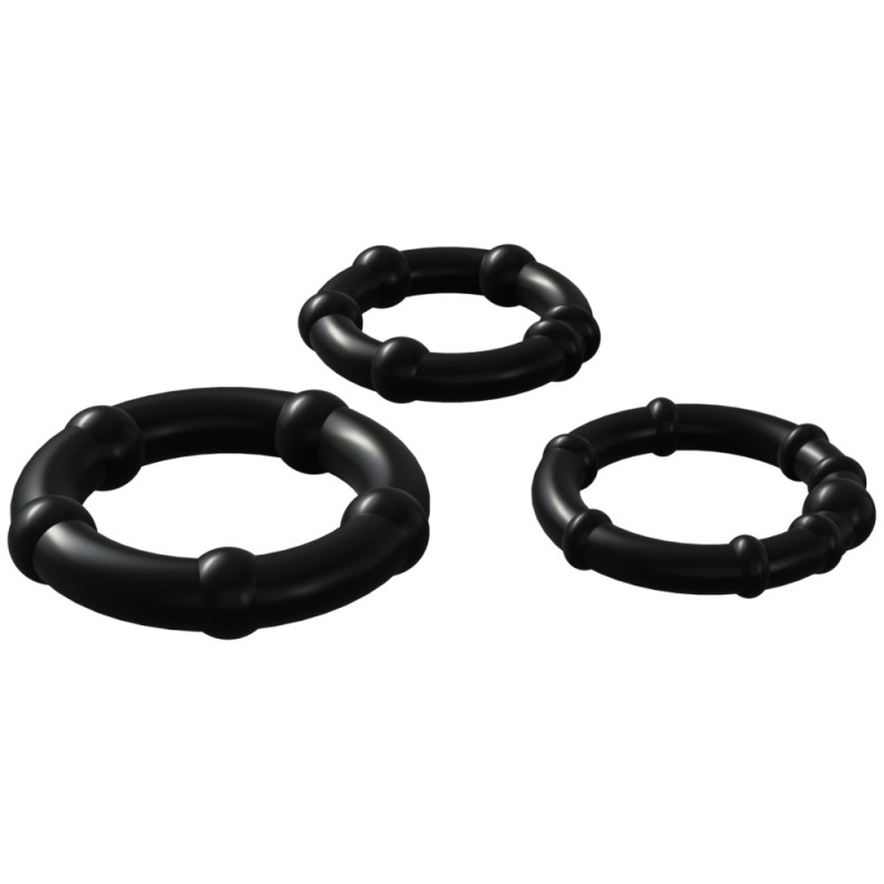 I tre cockring hanno un diametro rispettivamente di 2 cm, 2,2 cm e 2,5 cm e sono estensibili. Indossa uno degli anelli, quando il pene è in erezione, scegliendo quello che esercita la pressione desiderata per godere di un rapporto più duraturo e piacevole. Gli anelli fallici, infatti, sono stati progettati per migliorare le prestazioni sessuali di chi ha problemi di eiaculazione precoce, in quanto rallentano il deflusso del sangue aumentando la durata dell'erezione. Inoltre, i tre cockring possiedono sulla loro superficie dei piccoli rilievi sferici che andranno a stimolare anche lei durante l'amplesso.